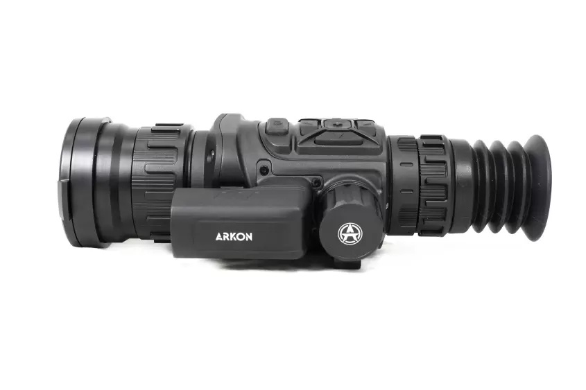 Германиевый объектив прицела Arkon Arma HR50L с фокусным расстоянием 50 мм и апертурой f/1.0 обеспечивает четкое и контрастное изображение. Базовое оптическое увеличение составляет 2,4х, а цифровое масштабирование доступно в пределах от 1х до 8х. Угол поля зрения (FOV) равен 8,8°x7,0°, что позволяет наблюдать область пространства размером 15,4 на 12,2 метра на расстоянии в 100 метров, обеспечивая широкий обзор.